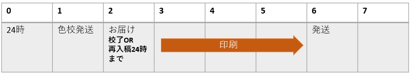 | 色校データ入稿 | 色校正出力 | 色校正確認 | 本データ入稿 | 印刷候補日 | 印刷候補日 | 発送作業 | 発送作業 | 午前納品 |